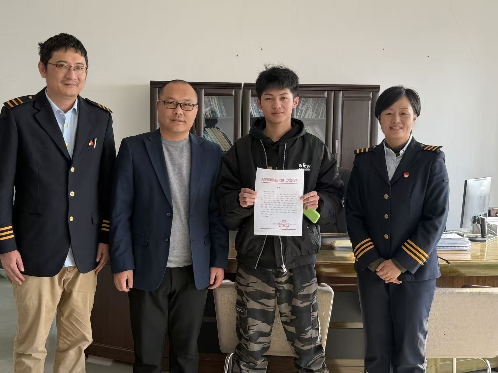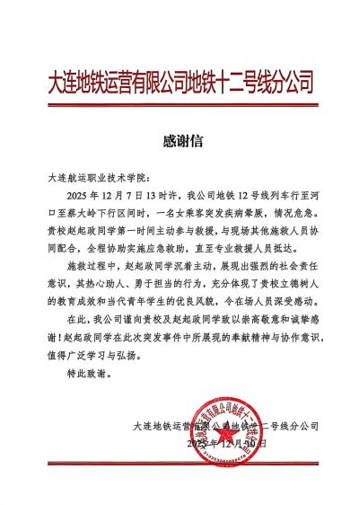 12月30日,一封真诚炽热的感谢信,由大连地铁运营有限公司地铁十二号线分公司郑重送达我校。这份沉甸甸的荣誉,属于我校电气学院25级电气自动化专业2504班的赵起政同学。