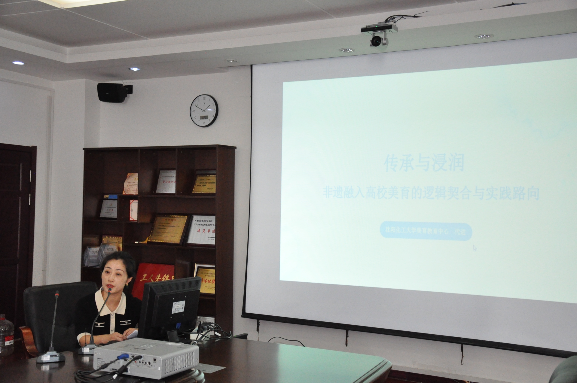 沈阳化工大学美育教育中心专任教师代进从非遗融入角度出发,分享了非遗项目从课堂延伸到生活的美育实践,体现“浸润式”育人的有效模式。