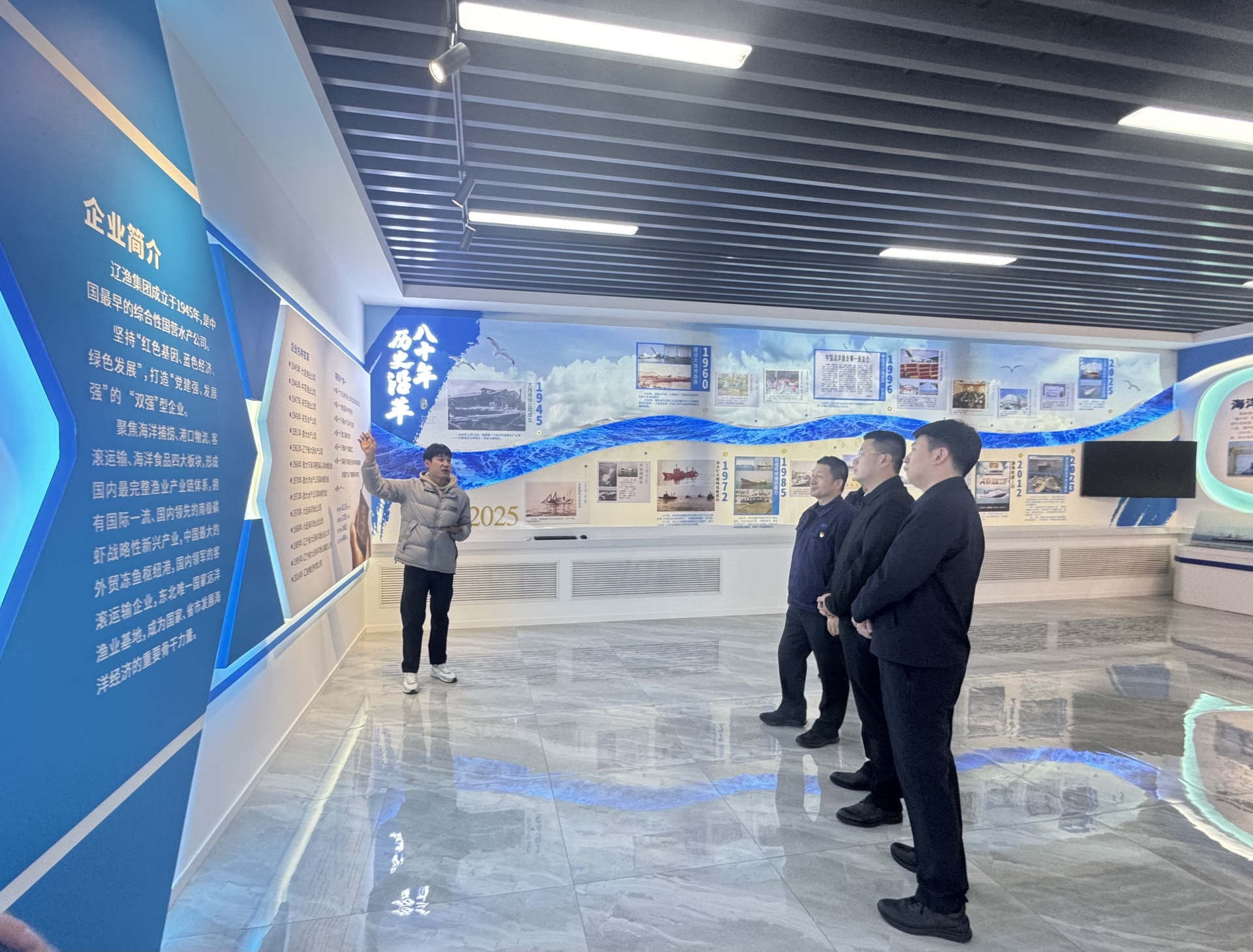 在辽渔集团有限公司人力资源部部长陈福锟、辽宁远洋渔业有限公司副总经理徐玉成陪同下,学校领导首先参观了辽渔历史展馆。展馆内陈列着大量珍贵的历史图片、实物档案与影像资料,系统再现了辽渔自1945年创立以来近八十年的发展脉络。从建国初期的艰苦创业,到改革开放后的产业拓展,再到新时代背景下的战略转型,一段段奋斗历程生动诠释了辽渔作为我国海洋渔业重要骨干企业的深厚底蕴与责任担当。