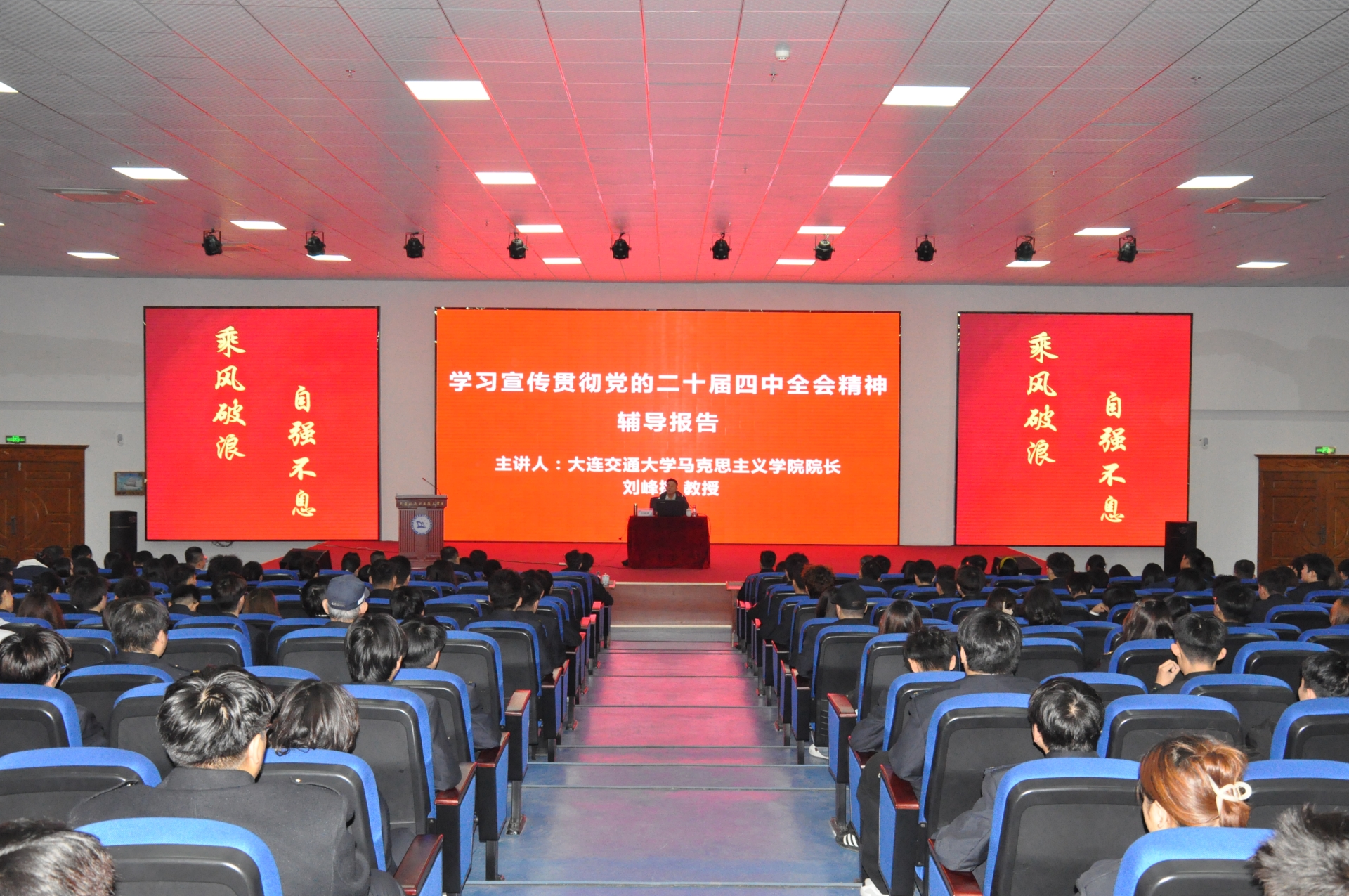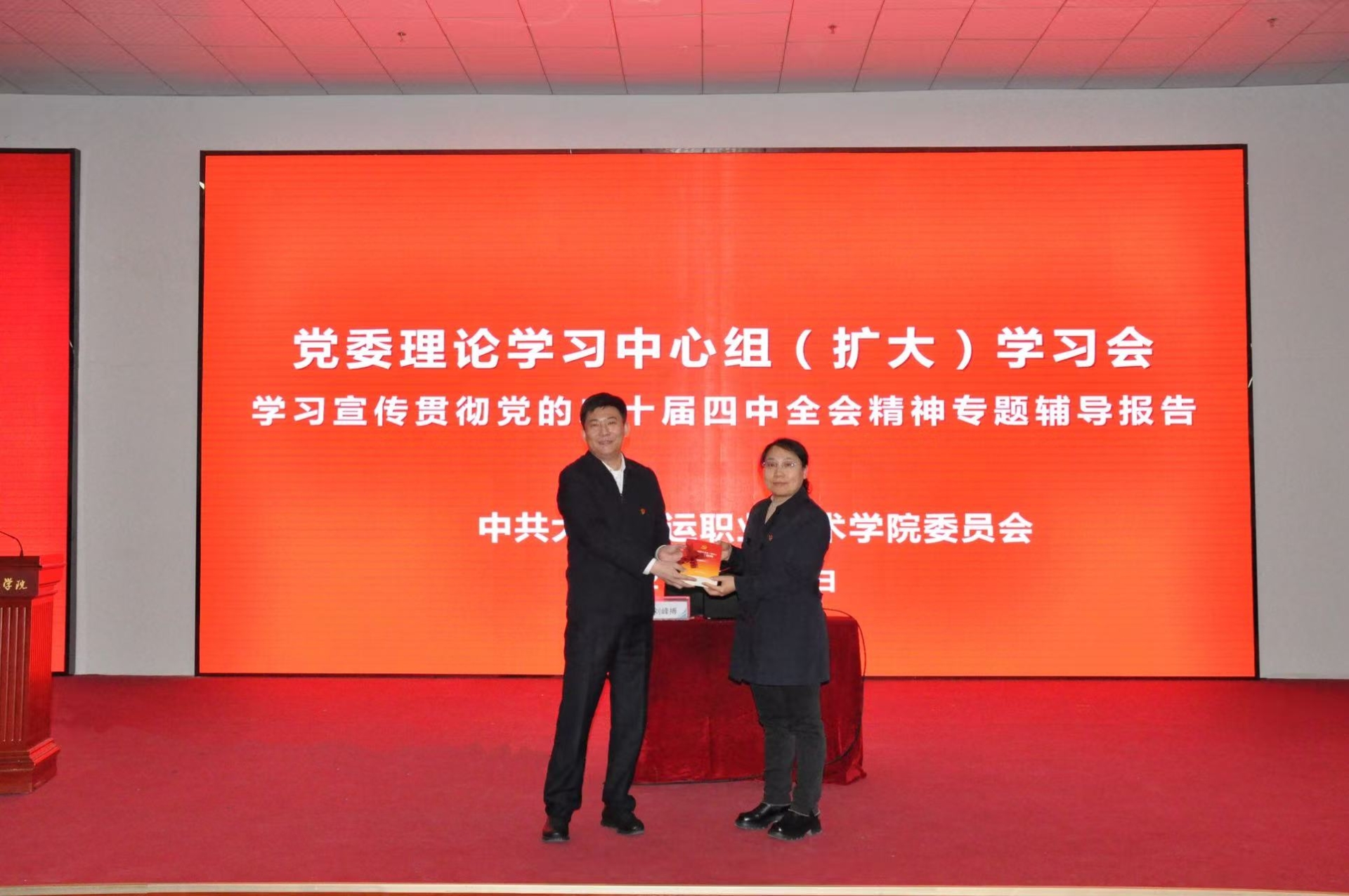 为深入学习宣传贯彻党的二十届四中全会精神,推动全校师生切实把思想和行动统一到全会精神上来,12月10日,大连航运职业技术学院召开党委理论学习中心组(扩大)学习会暨学习宣传贯彻党的二十届四中全会精神辅导报告会。学校党委书记崔学昶主持会议并讲话。会议邀请大连交通大学马克思主义学院院长、我校客座教授刘峰搏作专题辅导报告。学校党委副书记、校长吴鹏宣读关于成立学校学习贯彻党的二十届四中全会精神宣讲团的决定,并向教职工代表颁发学习辅导材料。会议对全校深入学习宣传贯彻全会精神作出部署。